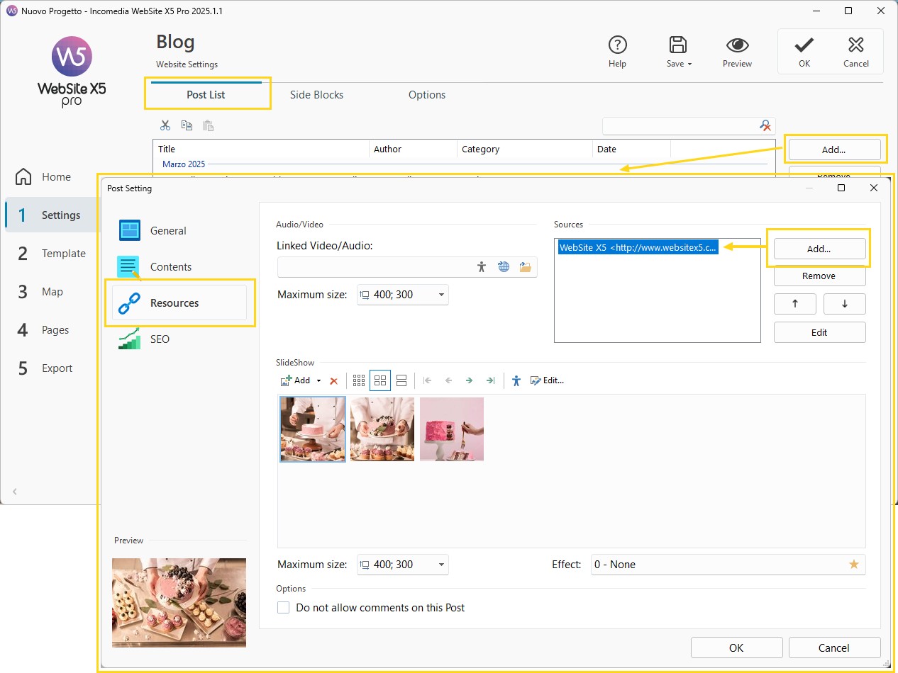 - Im Bereich Quellen klicken Sie auf Hinzufügen, um die erste Quelle zu erwähnen. Geben Sie den Namen der Website und die URL zwischen den Symbolen <> ein, z. B. WebSite X5 <http://www.websitex5.com>. Nur den Text wird dann am Ende des Beitrags vorhanden sein. Die URL wird dann als Link hinzugefügt.