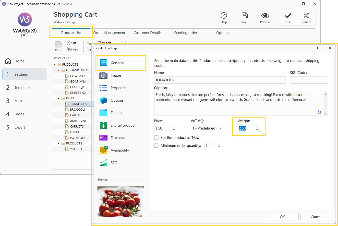 - Definieren Sie ein Gewicht für das Produkt im Fenster Produkteinstellungen > Allgemein.