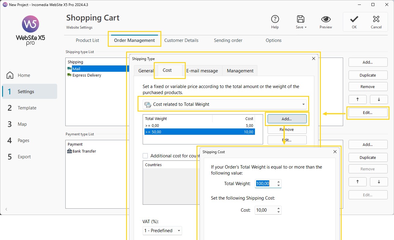 - Unter Kosten wählen Sie die Option Kosten für Gesamtgewicht und klicken Sie auf Hinzufügen. Geben Sie im nächsten Fenster das Gesamtgewicht und den entsprechenden Preis an.