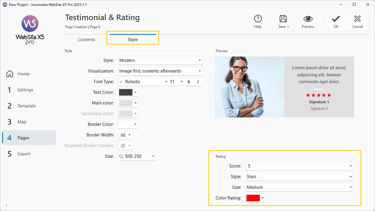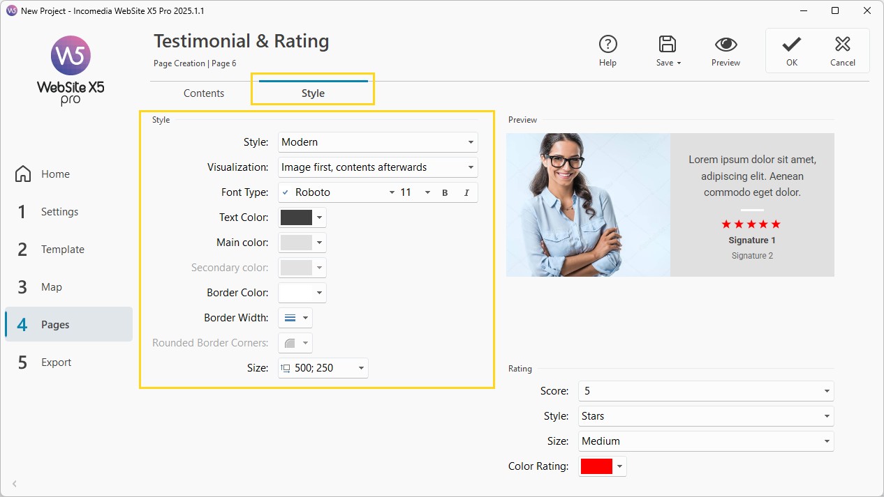 Nachdem Sie die Inhalte hinzugefügt haben, können Sie den grafischen Stil der Box für die Reviews definieren: Im Bereich Stil finden Sie zahlreiche Optionen: