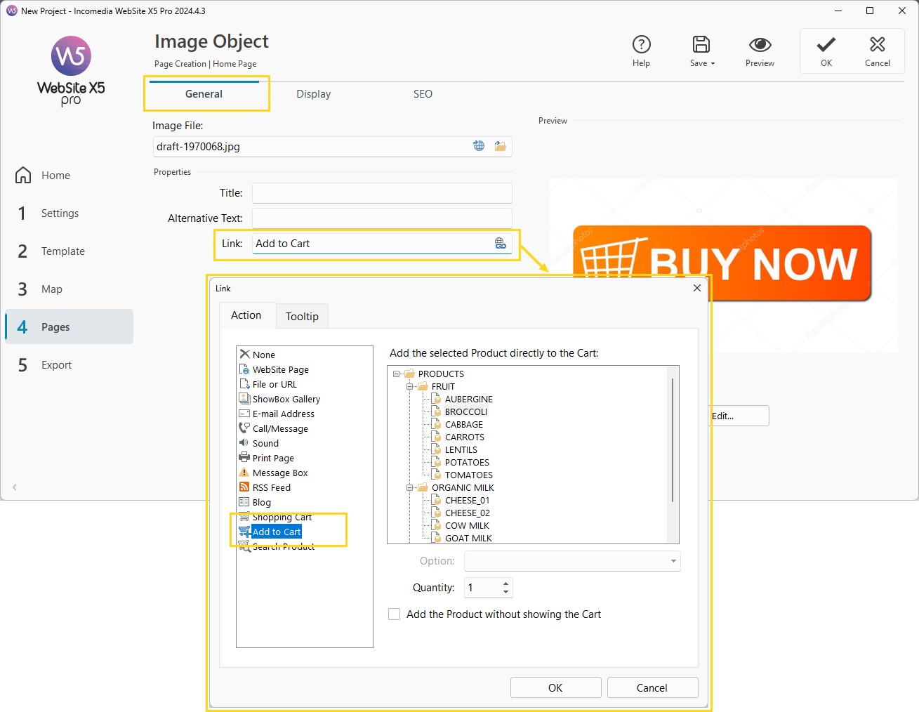 , um einen Link zu setzen. - Im Link-Fenster wählen Sie die Aktion Zum Warenkorb hinzufügen aus und markieren Sie das gewünschte Produkt zusammen mit der eventuellen Option und die Anzahl.