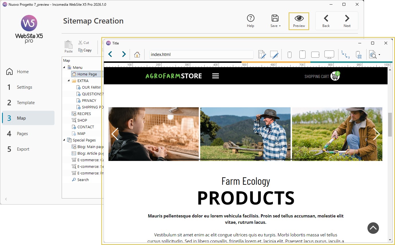 Währen Sie Ihre Website gestalten, können Sie jederzeit eine Vorschau Ihrer Arbeit anzeigen, um die Funktionsweise und die Darstellung der Seiten nachzuprüfen, bevor sie online veröffentlicht werden.