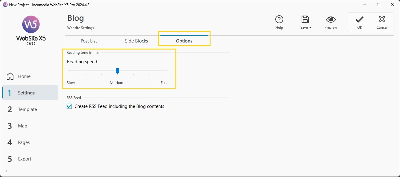 - Öffnen Sie den Bereich Optionen und stellen Sie die Lesegeschwindigkeit auf Langsam (etwa 100 Wörter pro Minute), Mittel (Standardgeschwindigkeit; etwa 180 Wörter pro Minute) oder Schnell (etwa 250 Wörter pro Minute) ein.