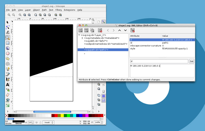 - Ausgehend von dem gezeichneten Polygon müssen Sie einen Pfad erstellen. Wenn Sie beispielsweise Inkscape verwenden, können Sie dies tun, indem Sie das Objekt auswählen und den Befehl Pfad > Objekt in Pfad umwandeln verwenden. Sie können den SVG-Code direkt in dem Fenster anzeigen, das Sie über den Befehl Bearbeiten > XML-Editor aufrufen.