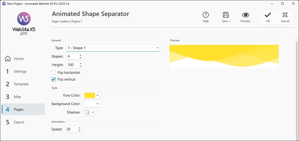 - Jetzt können Sie in WebSite X5 weiterarbeiten. Öffnen Sie das Animated Shape Separator-Objekt und wählen Sie als Typdie 'Benutzerdefinierte Form'.