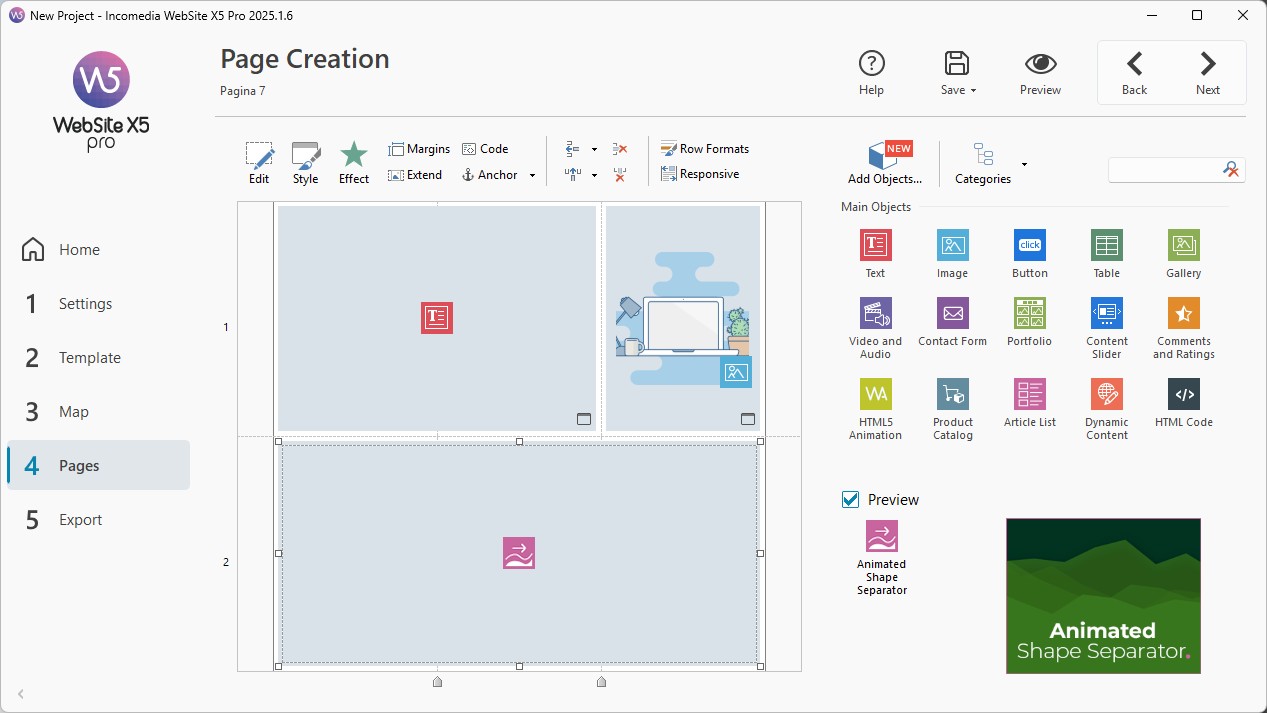 - Im Schritt 4 - Seitenerstellung fügen Sie in Zeile 1 ein Text-Objekt und ein Bild-Objekt nebeneinander ein. In Zeile 2 fügen Sie das Animated Shape Separator-Objekt ein.