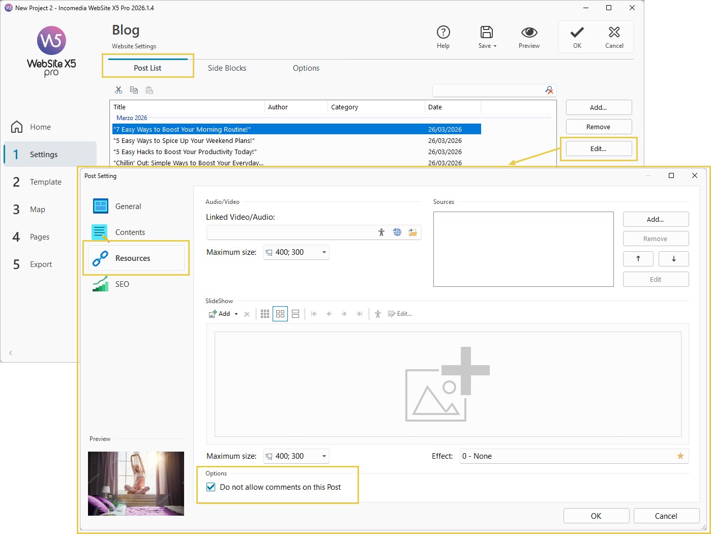- Go to the Resources section and activate the Do not allow comments on this post option.