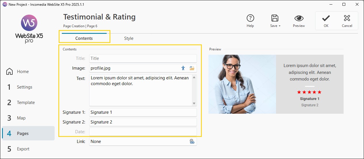 • In the Testimonial & Rating > Contents window, click on the button to open the Link window.