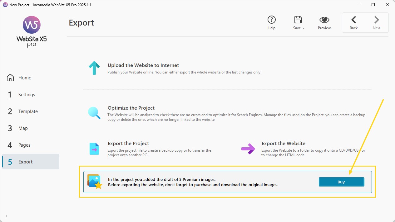 - Go to Step 5 - Export: you will find a box reporting the number of Premium Images on your project. Click on Buy.