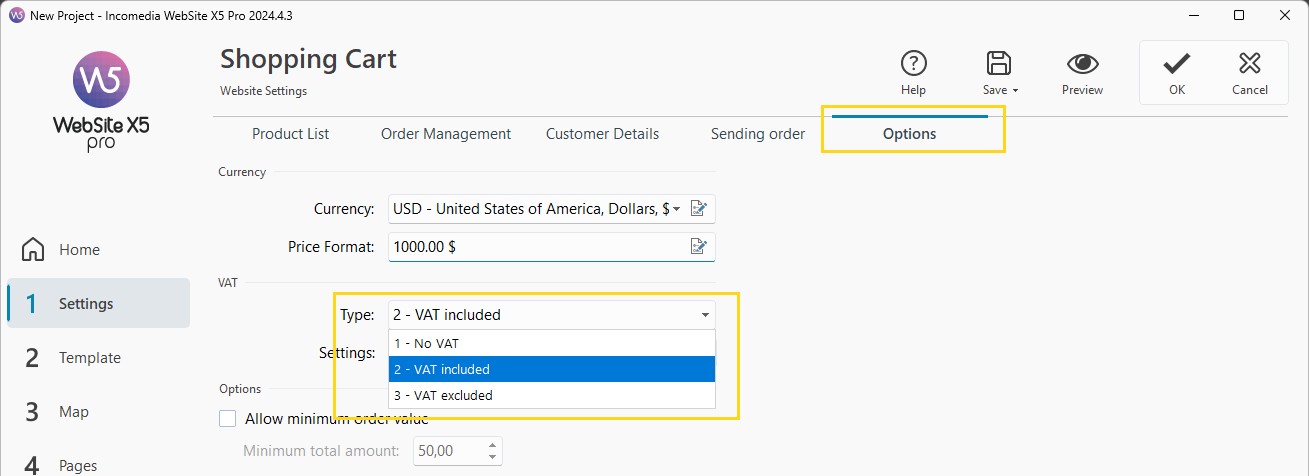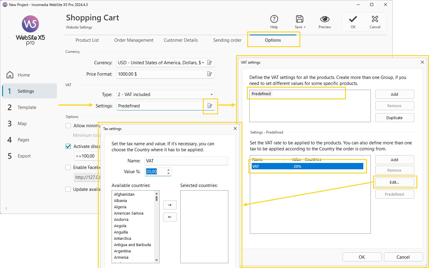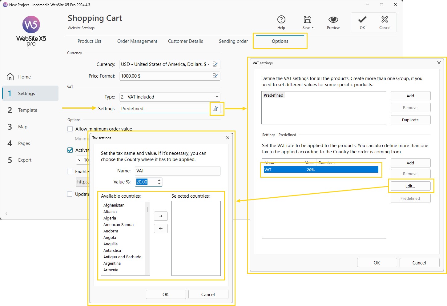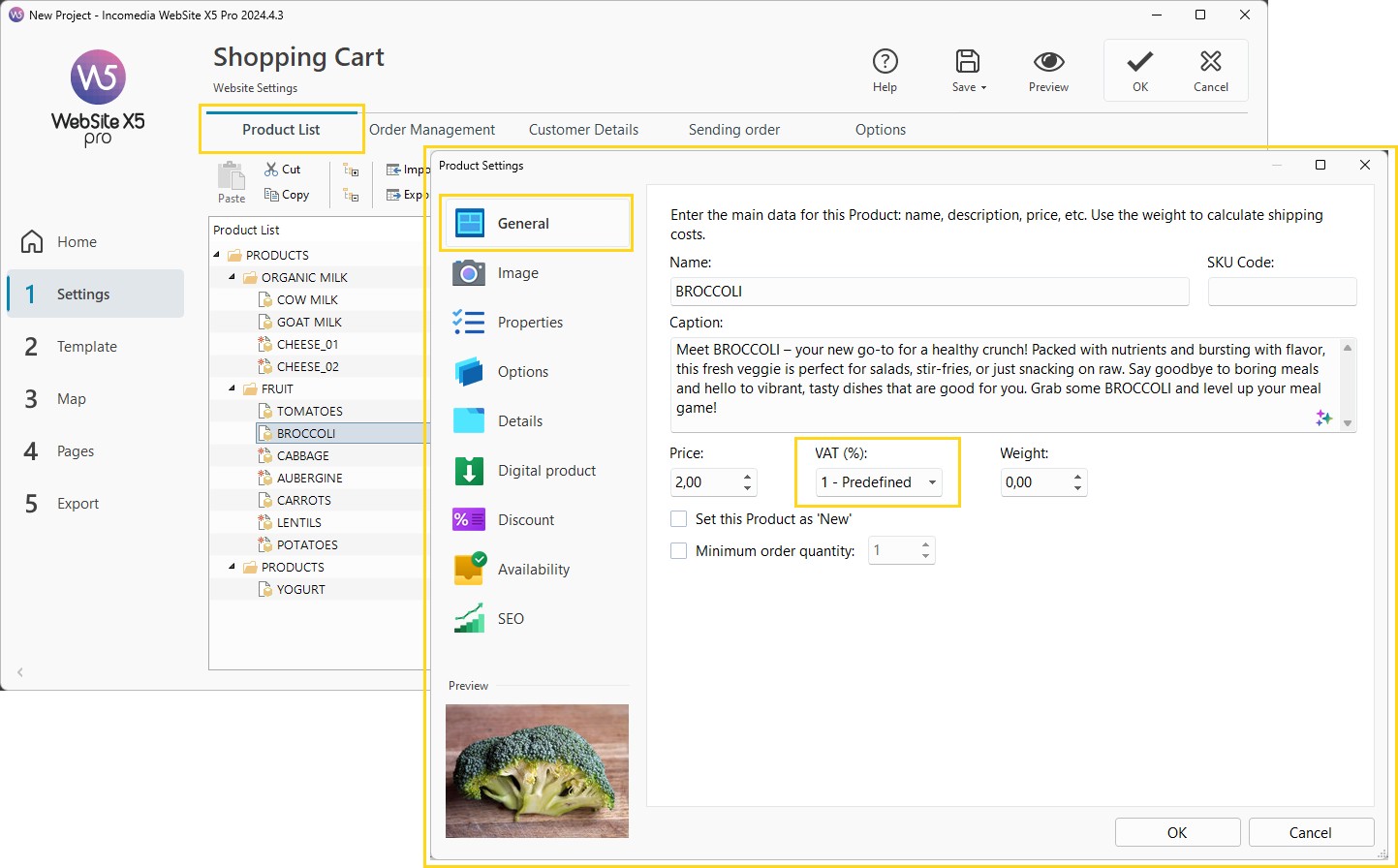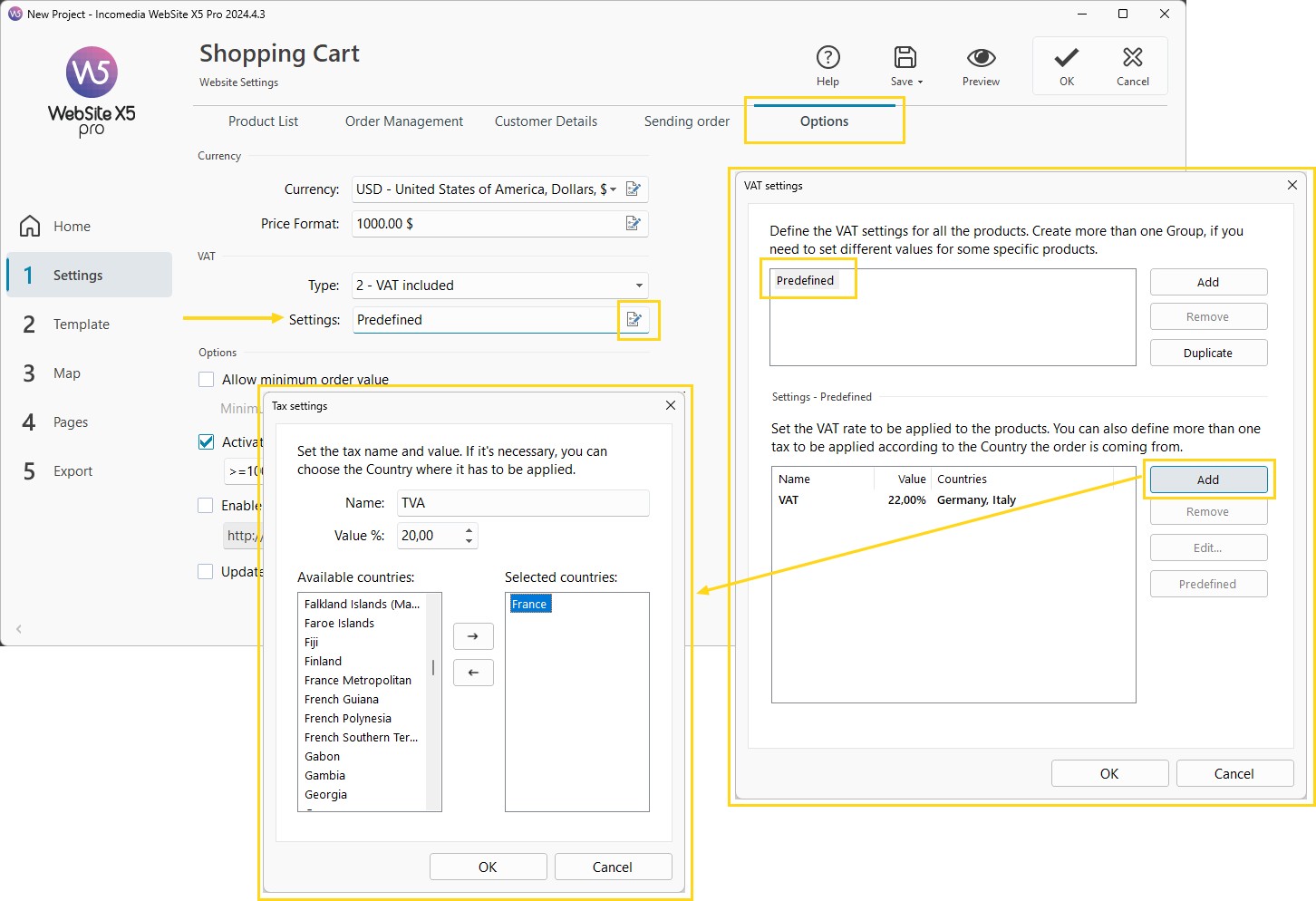 The default VAT is set according to the language chosen when installing WebSite X5: if you chose Italian, the default VAT value is 22%, if you chose French you will find a default TVA value at 20%.
