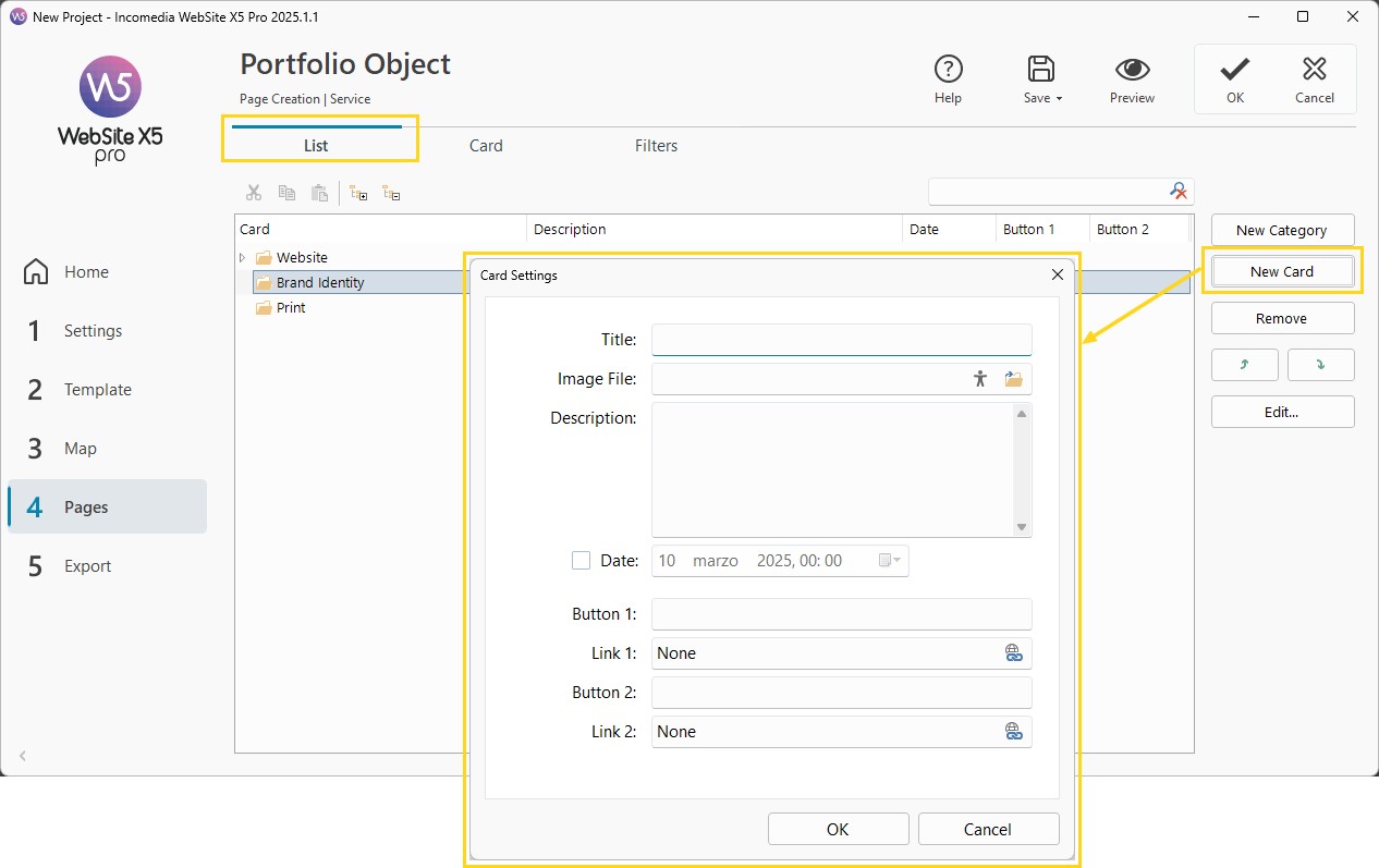 - Also decide if you want a date to be displayed on the card, possibly from the period in which you worked at the element you are presenting: in this case, activate the date option and use the calendar to set it. Associating a date to the cards is necessary if you want to allow chronological sorting.