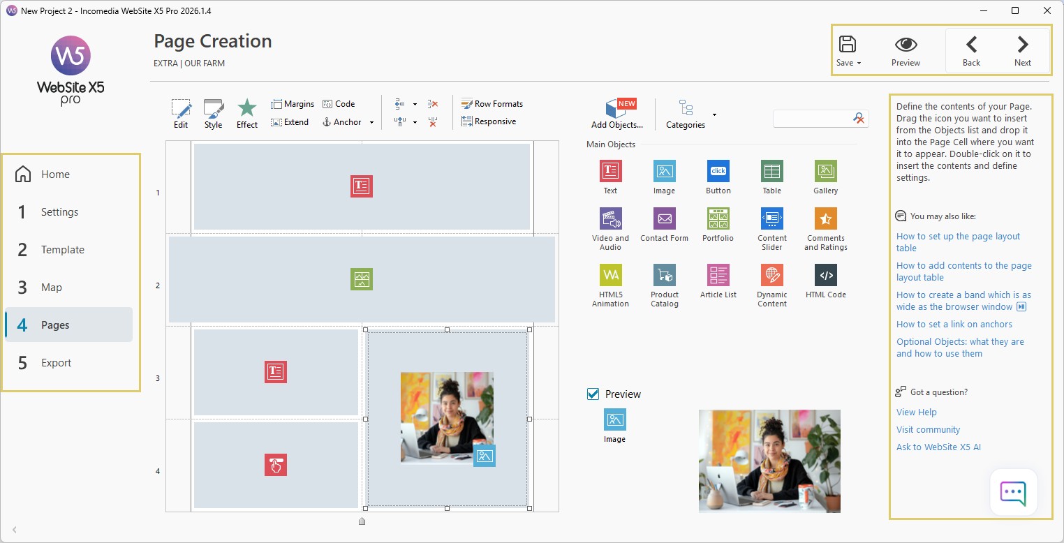 WebSite X5 takes you through the work of creating a website in just 5 steps, which are clearly reported on the side button bar, namely: