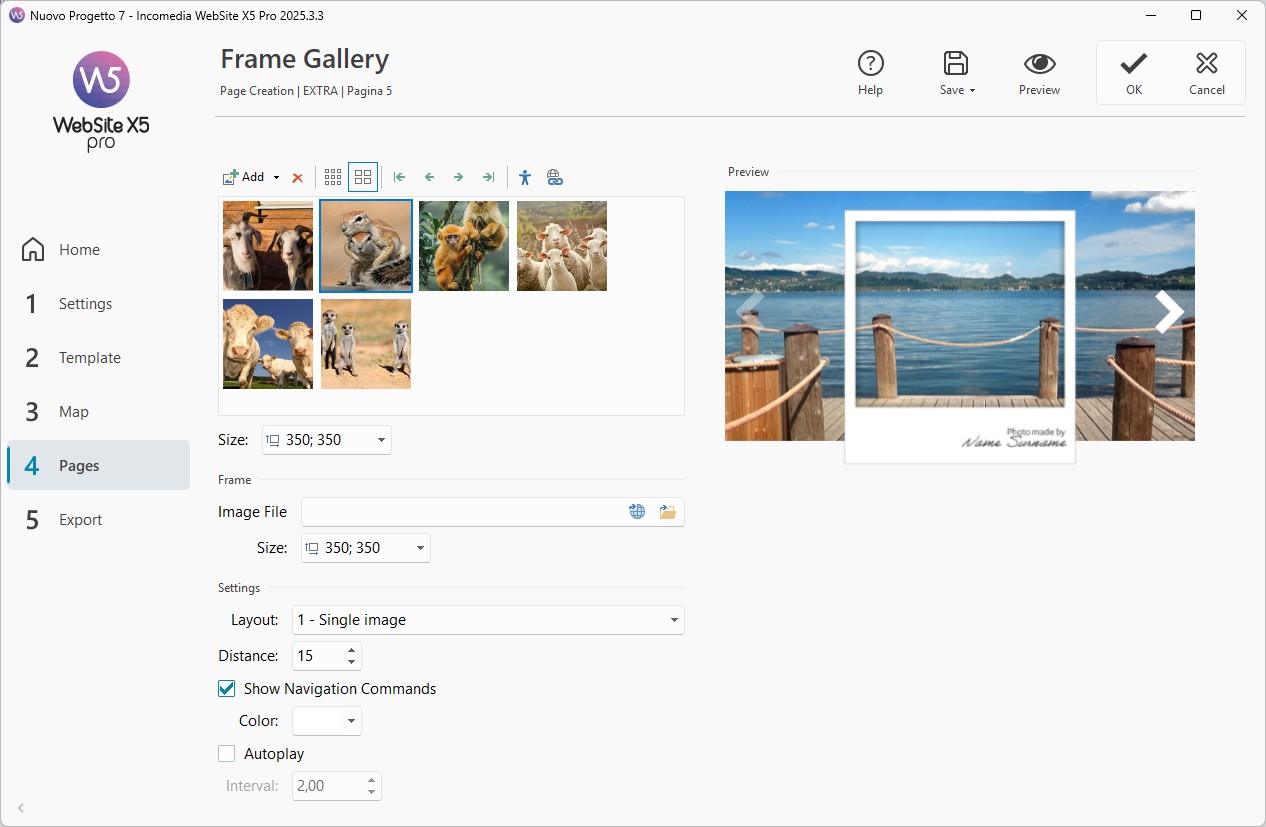 - Double-click on the Frame Gallery Object you just added on the page to access the settings window.