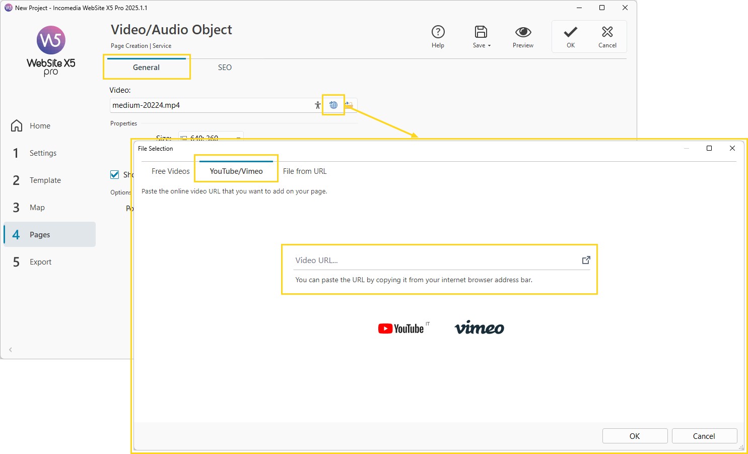 in modo da richiamare la finestra Selezione File e apri la sezione YouTube/Vimeo. - Digita la URL del video online che vuoi inserire nella pagina: puoi incollare direttamente la URL copiandola dalla barra degli indirizzi del tuo browser internet.