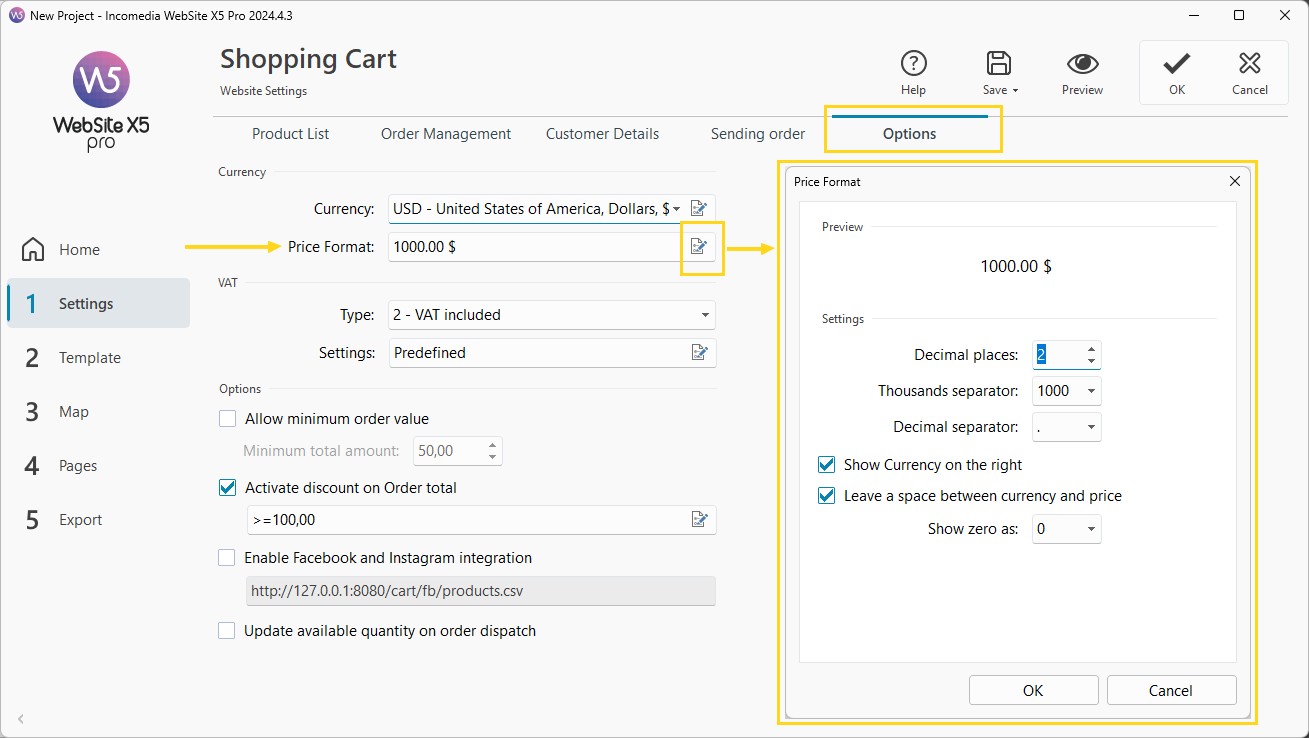 - Mostra uno spazio tra valuta e prezzo: scegli se inserire uno spazio tra il simbolo di valuta e la cifra (per esempio, 100 € invece di 100€).