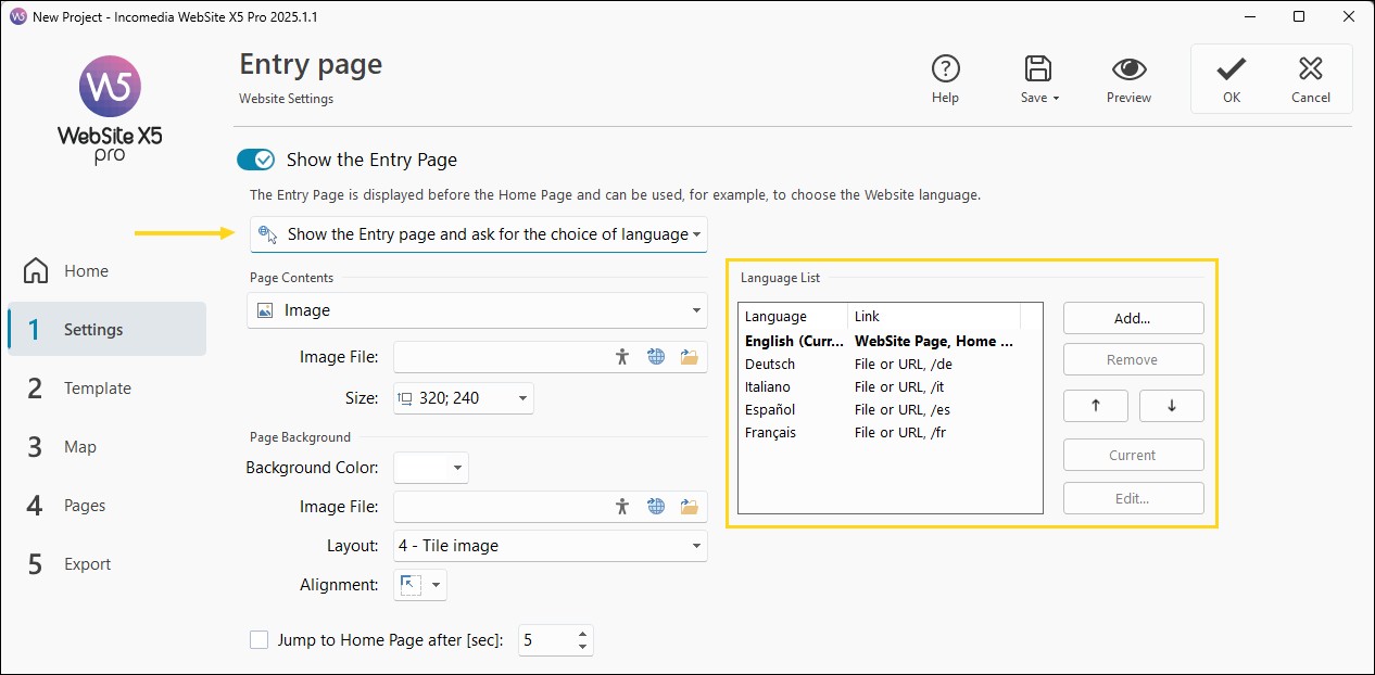 - Dopo aver cliccato sulla voce Attiva pagina di ingresso, seleziona la voce Mostra la Pagina di ingresso e richiedi la scelta della lingua.