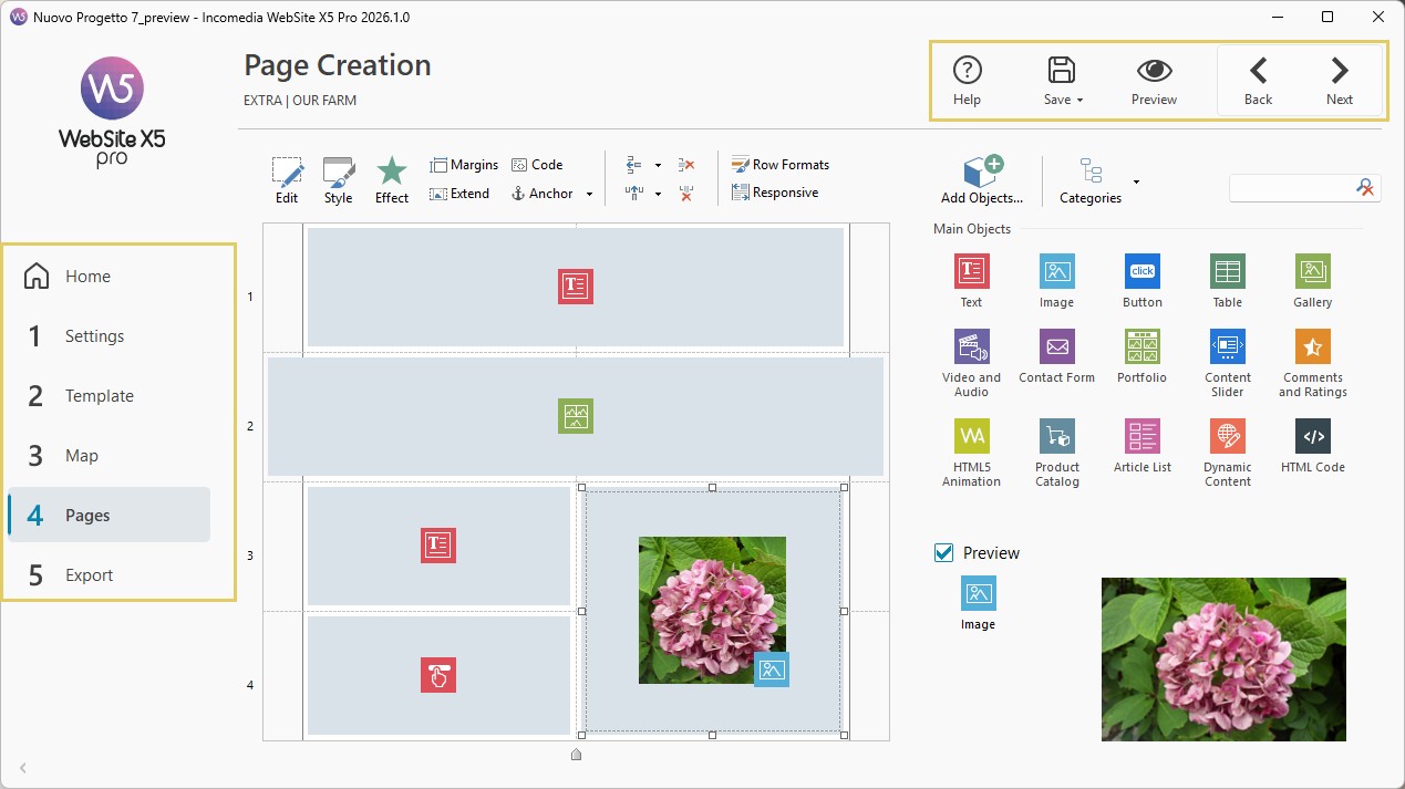 La condotta guidata di WebSite X5 è organizzata in 5 passi chiaramente visualizzati nella colonna sinistra della finestra del programma. Nello specifico, sono: